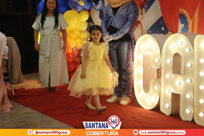 A cerimônia contou com a presença dos padrinhos da turma, Pe. Jacyel e Thamirys Anjo, da Psicóloga Priscila Soares, e dos proprietários da escola, Clóvis e Fábia Alécio, que juntos compuseram a mesa de honra e conduziram o evento com leveza e elegância. Um dos momentos mais marcantes da noite foi a tradicional dança da valsa, que ganhou um toque ainda mais encantador com o cenário circense da Disney, protagonizada pelos pequenos formandos ao lado de seus pais e familiares, emocionando a plateia.